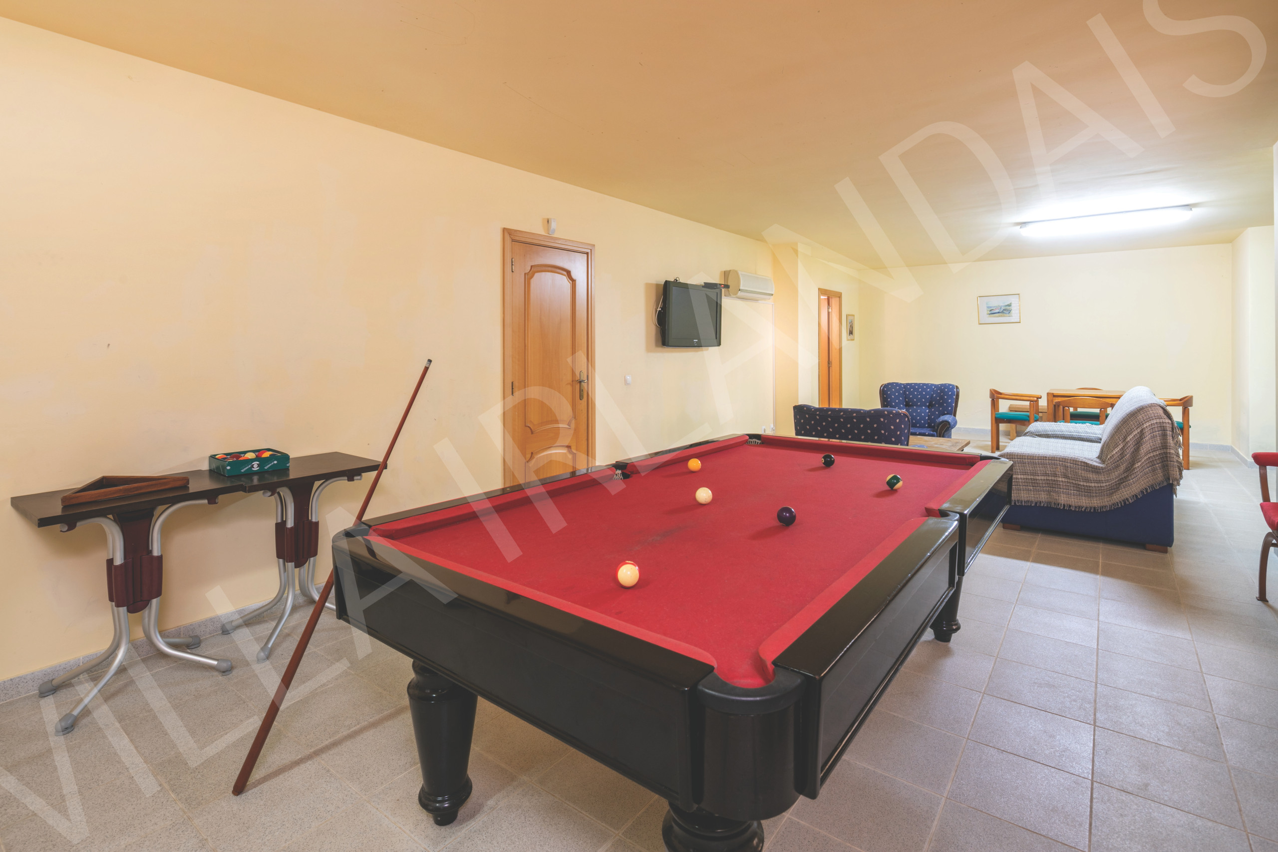 The villa is arranged over three levels, helping to spread out living and sleeping areas for larger groups. On the ground floor, there is an ensuite double bedroom, along with a games room and second TV lounge 🎱⚽. This level also includes a bathroom with shower and access to the outdoor laundry room, equipped with a washing machine, dryer, and pool items 🧺. From the games room, there is direct access to the pool and BBQ areas, making it easy to move between indoor and outdoor spaces.